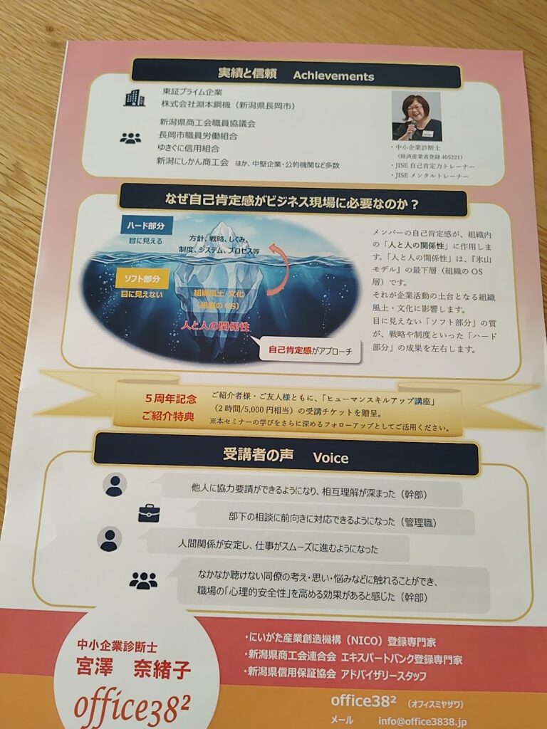 「自己肯定感を成果に変えるビジネスパーソンのための『マインドセット1day集中セミナー』」のチラシ。